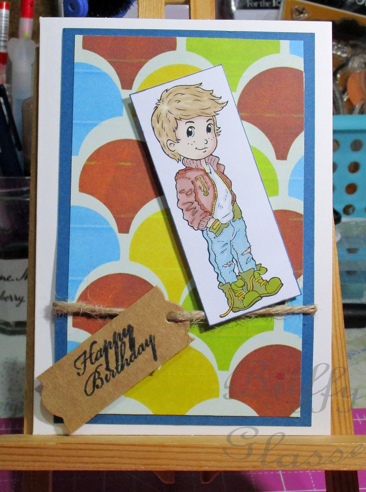 Now without further ado, here is my little bit of inspiration, I have used the digi stamp "Casual Boy" and a a digi Retro backing paper.